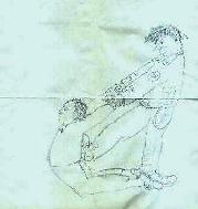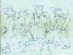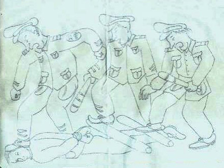 几个不知名的恶警,把我面朝下踢到在地,用穿皮鞋的脚踩住脸,然后把几根几寸粗的木棍放在大腿和小腿部位,几个彪形警察踏在木棍上滚来滚去的压腿。这种能够使人腿肚部位的肌肉严重分离,象糖葫芦一样,一节粗,一节细,受伤处呈黑紫色,胀痛难忍,严重的可导致腿残废。