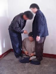 ![]() 恶警指挥打手迫害大法弟子 | ![]() 恶人逼迫大法弟子双盘并站在大法弟子腿上用力踩跺 |