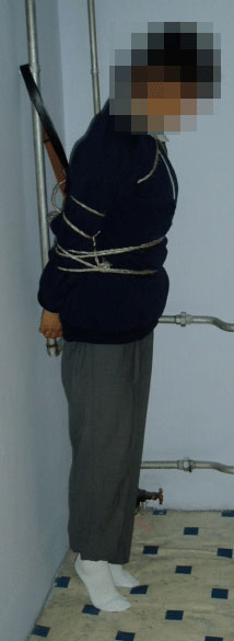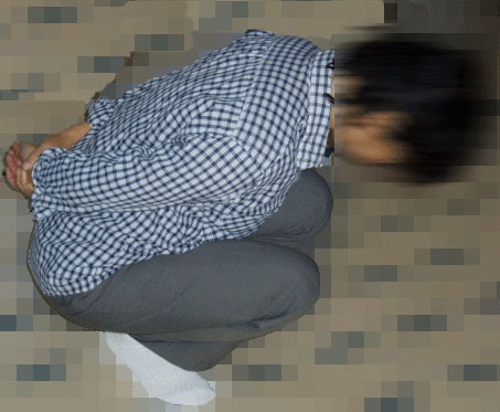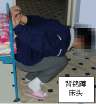 5、背铐蹲床头:此种迫害姿势使人蹲不下、站不起,长时间蹲不让上厕所,有的人都尿裤子了。双腿、跨疼痛难忍,浑身冒汗,呼吸困难,有人蹲近15个小时。
