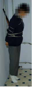 7、为防止说话,嘴里被塞進没洗的裤头、袜子,长时间坐刑椅,臀部坐烂,痛痒难忍。