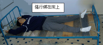 8、双臂扣在两个床上(上床),四个人分别往两边拽床,将人抻起,抻得惨叫,五脏六腑抻碎一样痛,为防止喊出声,用胶带封嘴后,反复抻。