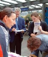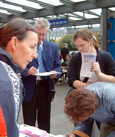 反酷刑展中遇到了一位中年的原南斯拉夫人。他看了酷刑展并详细的看了所有的图片之后,情绪非常激动。经了解才知道他现在瑞士避难,他一家有四人被米洛舍维奇下令杀害了。他指着江泽民的照片说,他和米洛舍维奇一样残害本国的百姓。米氏现已被海牙国际法庭审判。江氏也应得到和米氏一样的下场。当学员告诉他江氏已在多国被告上法庭之后,他说你们一定会胜利!