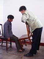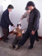 ![]() 逼迫大法弟子坐在长条椅上,恶人用椅子的一条腿作为支撑点压在大法弟子的一只脚背上,然后全身压在椅子上,全身用力压椅子,一面前后摇晃椅子,一面问大法弟子“疼吧”。 |