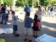 也有不少人看了我们的洪法图片和炼功动作之后,马上表示要学炼法轮功。有的主动询问当地炼功点的联系电话,有的当场向我们学炼五套功法。下午的时候有许多抗议团体在校园上,他们大声的演讲与口号让整个校园充满了喧嚣。相比之下我们的展位则是一片祥和与宁静的氛围,有的人对我们说“你们是校园上唯一清静的地方,那是我为什么到你们这儿来的原因。” 也有的人对我们说“你们这儿的能量场很强。”由于我们的展位与众不同,不仅吸引了众多的过往人群,也吸引了不少新闻媒体的注意力。有2~3家电视媒体采访了我们,并向我们详细了解法轮大法的功法特点及江氏流氓集团对法轮功残酷迫害的真象。由于大家心态都很正,心中只想着如何才能更好的洪法讲清真象与助师世间行救度众生,弟子之间互相配合默契,洪法讲真象的效果出乎意料的好,不仅我们准备的四~五千张真象传单很快就发完了,而且人们也很愿意了解法轮大法及江氏流氓集团对法轮功的残酷迫害,并表现出应有的善心与支持。