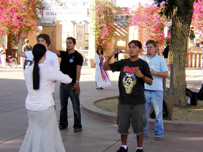 2004年10月13日,我们凤凰城的大法弟子与开车赶来的拉斯维加斯大法弟子,瑞典大法弟子,及图桑大法弟子一行15人来到亚利桑那州立大学的校园开始我们洪法讲真象的活动。我们在校园的中心地带摆设大法洪法图片,及揭露江氏流氓集团残酷迫害的酷刑展图片,一部分弟子随着优雅的炼功音乐炼起五套功法,一部分弟子向来往的人们散发真象资料。很多过往的学生及来访人员纷纷被我们的展位所吸引而驻足观看,我们在炼功的弟子面前摆上一些美丽的纸制莲花,不少人主动拿我们放在图片角上的真象传单并仔细观看,有疑问的主动向我们询问,也有不少人向我们索要莲花。很多看过酷刑展图片的人都被江氏集团的残暴所震惊,不少人不由自主地说“我的天,他们(江氏流氓集团)怎么可以这样灭绝人性?”“我的天,(江氏流氓集团)太残忍了。”有的人特地带朋友来看酷刑展图片,并把大法弟子告诉她的真象转述给她的朋友。