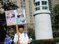 下午晚些时候,我正背对着身后的百老汇大道,在人行道上向往来的民众发资料,一回头,不知什么时候身后停了一个中国人。他单脚点地,身子和另一只脚还在所骑的自行车上,正以一种复杂、冷漠而又略带嘲讽的表情看着我们。我走过去冲他笑笑,递给他一份传单,他没有接,毫无表情的说,“法轮功啊?”眉间还是一种不信任、不屑、但又迷茫、期待的表情。我说,你看看吧,我们都是从几小时以外的城市赶来的,你看看那些女士和先生们,这些人都受过良好的教育,是博士、硕士、教授、专业人士。我们来这里,没有别的目地,就是想真心的告诉你,法轮功真的很好,迫害是错误的。他的面部松弛下来了,问我,你们有中文的吗?我赶紧从其它学员处找到几份中文资料,外加自焚光盘递给他,这时他高兴的接受了,放到了包里。然后,轻松的跟我们道别,骑上自行车走了。