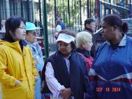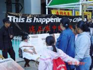 ![]() 大法弟子在街角展示展板和发传单 | ![]() 人们在听法轮功真象 | ![]() 人们在看反酷刑展 |