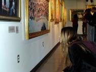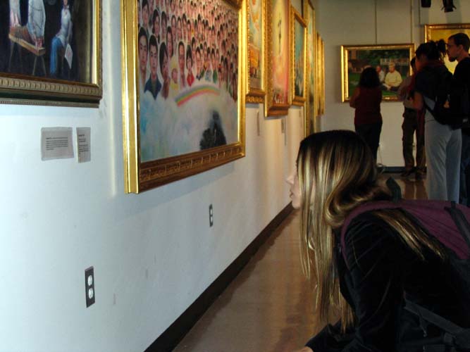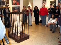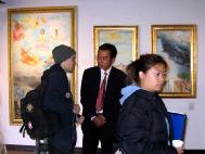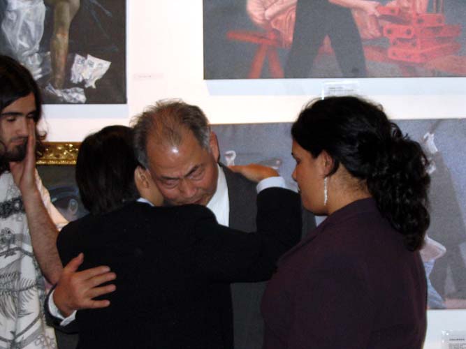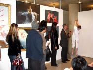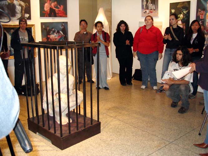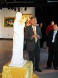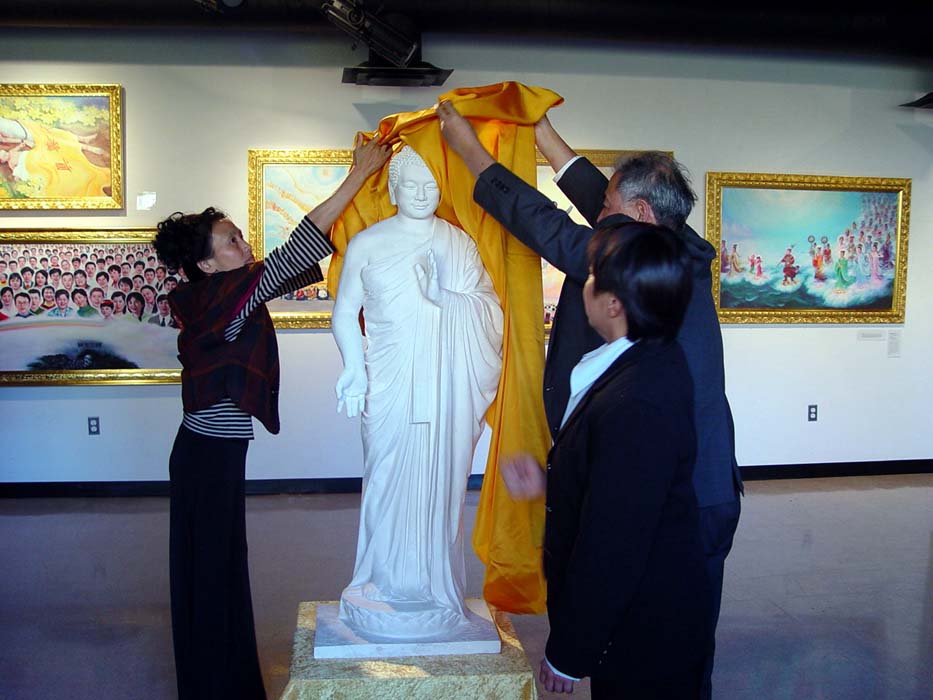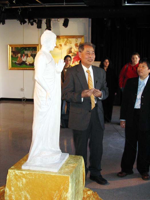 第二个开幕式在Eleanor Winters Gallery。这个艺术馆的负责人也给了展出非常多的帮助,从设计到搬运到最后的装画,她都帮展出达到最好的状态。这里,主办者揭开了张教授的另一个作品:“主佛像”。当包裹在黄绸里的佛像揭开时,所有的人都感到赞叹。所有的人都聚精会神的上前凝视他的庄严与慈祥及那逼真的神功。教授讲解了该作品的创作过程。他说,从前,他是个无神论者,是法轮大法的法理改变了他,他认识到了法轮大法的法理是科学的,他的内涵比现在的科学还要科学。在很多他经历的现实中,他不得不改变他原有的不信神的想法。于是,他用艺术的语言,雕塑,把他心目中最慈悲的神的形象展现在这个作品中。这一席话,引来了无数的感动的掌声。最后,大家用茶点的方式轻松的闲聊。很多学生也陆续的来到了画展。