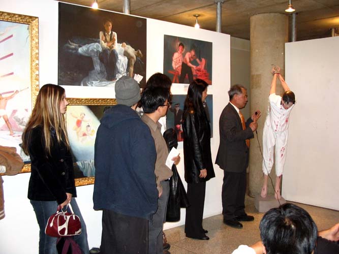 12日下午,三座雕像在作者张昆仑教授及从美国来的参展画家汪卫星与另一位渥太华的参展画家兼教师凯瑟琳•吉理斯的揭幕下展出。三个作品分别题为“牢笼”,“死亡姿势”和“主佛像”。这三个作品分别陈列于两个不同的展厅。开场由张教授介绍了组织该画展的源起,和过程中的酸甜苦辣。接着,约克大学的布鲁斯教授表达了他对这个画展的重要性的演说,他并鼓励他带来的学生来了解了解法轮功,他说,这个画展很重要,它能让学生们了解到现在正在发生的事,并且是一个很好的机会来了解法轮功;他本人也感到很高兴,能有这样的机会将这样的画展带给学生。后来,几位艺术家们揭开了在Akasa画廊展出的两件作品“牢笼”和“死亡姿势”。当揭开“死亡姿势”时,张教授忍不住的落泪了。作者是教授的好朋友。他说他是一个心地很善良的人,当他知道了中国的法轮功学员在受这样的酷刑,他便压抑不住的要把这个作品创造出来。在场的观众,这时也纷纷给予教授鼓励的掌声。之后,几个媒体也都来采访艺术家们。