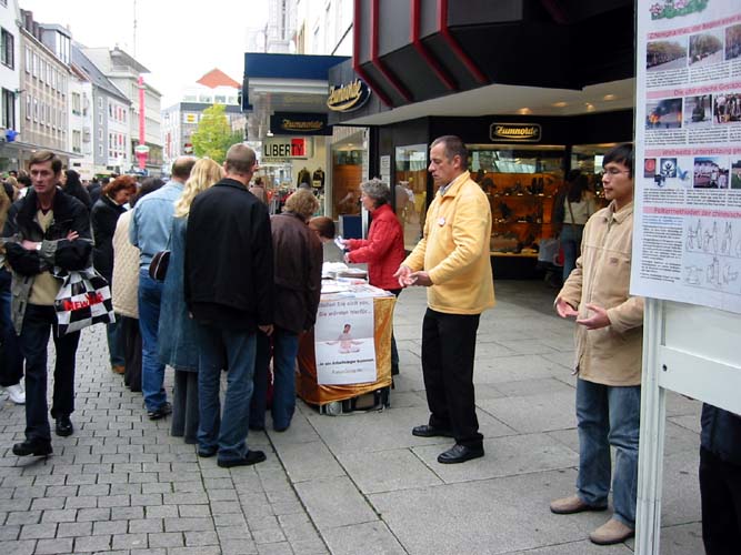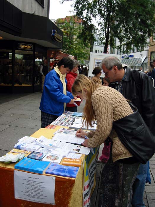 在欧斯纳布鲁克,街道上挤满了人,他们主要是来购物的,大批的人潮经过法轮功的信息展位,由于太多人潮汇集,人们都被后面的人推進经过展位,所以几乎不可能与任何人交谈或散发传单,但是仍有大批感兴趣的人群设法围绕在展板旁观看,许多人也过来在请愿书上签名,支持将迫害法轮功的前中国国家领导人江××送交法庭,审判其所犯群体灭绝、酷刑和反人类罪行;在欧斯德侯兹-斯洽姆贝克,也有许多人知道了有关法轮功和正发生在中国这场迫害的真象。