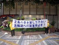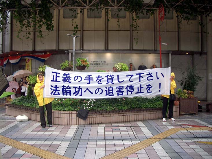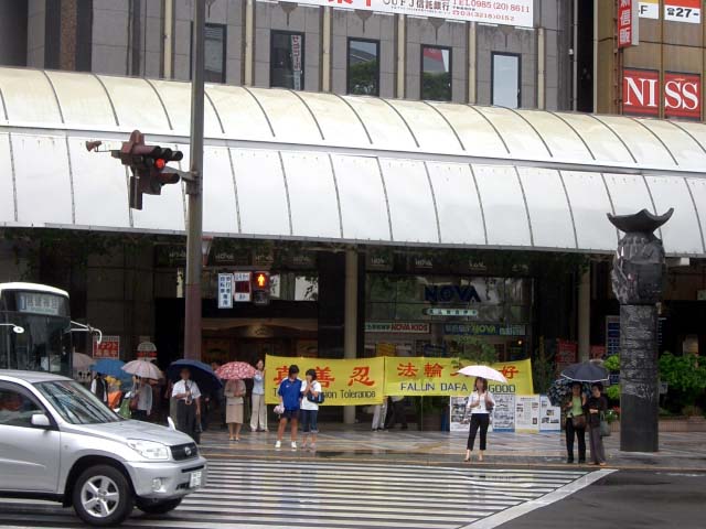 与此同时,从10月6日到10日配合人权会议会场的讲真象,一部分学员在宫崎市最繁华的街头向当地民众洪法。虽然在街头的学员不多,但大家协调配合,打横幅、功法展示、发报纸都做的非常有序。大家普遍感到当地的民众非常纯朴,非常喜欢接受法轮功真象小报,8日这一天虽然受台风影响,下了一整天雨,但丝毫未影响街头的洪法,在雨中学员们打出的横幅更加绚丽夺目。