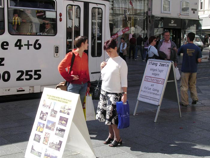 【明慧网2004年10月19日】法轮功学员在奥地利林兹市(Linz)电车站正对面主要的购物街的中心设置信息展位,提供电车旅客一个观看法轮功横幅及功法的机会。很多人都对法轮功有兴趣并纷纷取走简介。人们通过这个机会获知法轮功学员在中国大陆无辜遭受