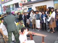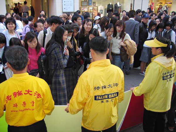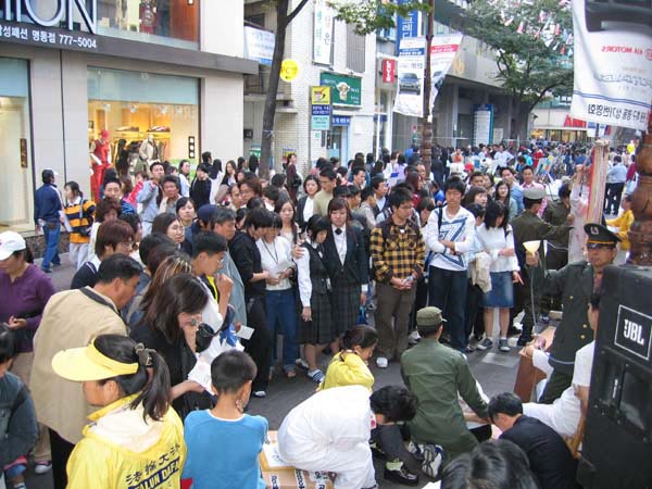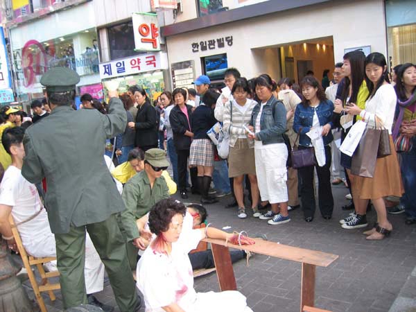 下午2点,酷刑展终于开始了,网罗古今中外的酷刑,极端邪恶无道的拷问,由化了妆的学员们生动的展现了出来。不久如潮的人流开始向酷刑展现场云集。许多人在观展之后震惊不已,纷纷主动要求听取真象。有的高中学生义愤填膺,并说一定要告知周围的人。场地四周,相机的闪光灯此起彼伏,霎时间,酷刑展便成了明洞的焦点。