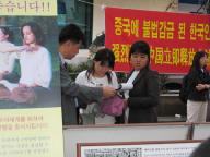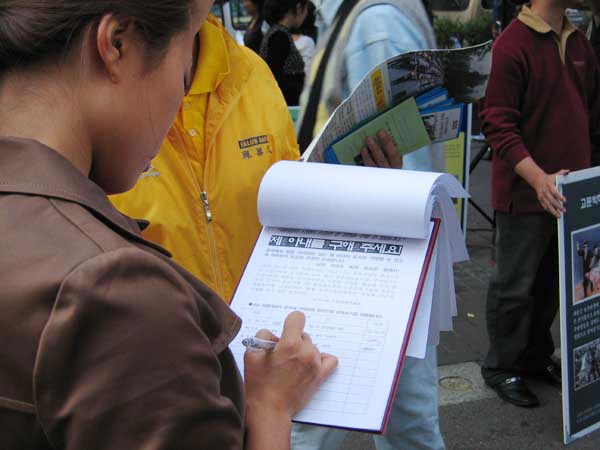 在酷刑展的同时,为营救被监禁在佳木斯劳教所,正遭受严刑拷问的韩国人的妻子——高成女女士的征签活动也一并举行。许多人通过签名的方式表达了反对中国镇压法轮功以及谴责江氏集团残酷镇压的心声。在韩国,截止现在已有逾4万人参加到援救高成女的征签活动中来。