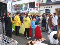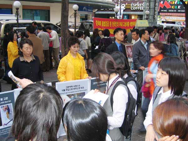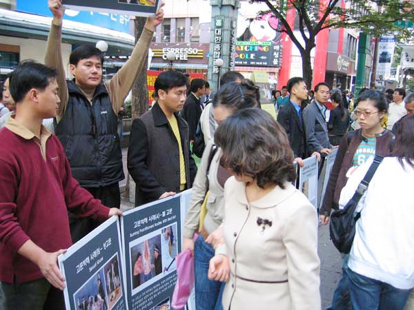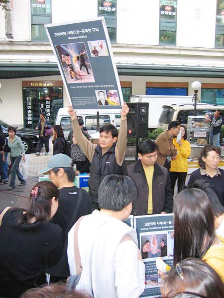 在此次酷刑展中,考虑到韩国的一些特殊性,事先选定一位主持人,对中国镇压法轮功的真象進行解说,同时也对酷刑展作了简要介绍。听到主持人诚挚而又富有号召力的嗓音,许多过往的世人停下了脚步,边看酷刑展边倾听解说。