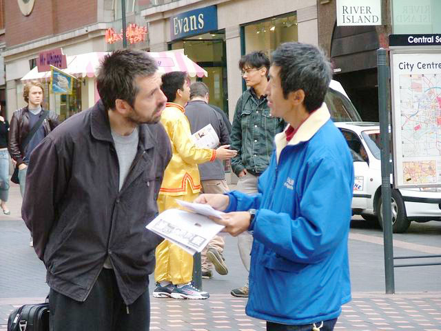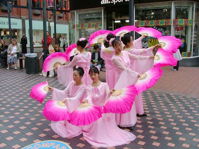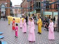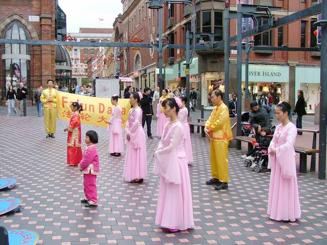 在利兹(Leeds)热闹繁忙的商业中心,其间的一个小广场成了学员们展示功法及舞蹈的最佳舞台。许多过往的观光、购物的人们,都被场中的表演所吸引,驻足观看。学员们展示的五套功法,祥和宁静,让人们感到气氛轻松,心情愉悦。在优美的练功音乐及解说中,不时有人模仿着学员的动作,也尝试起来。功法展示结束后,许多人都对当地的免费教功班表示浓厚的兴趣。