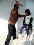 恶警郭强见我坚决不配合,便顺手拿起皮带,一把勒住我的脖子,把我从沙发上拽起,继续逼问我,见我不说便用皮带狠狠打我的头(演示图1),我大声叫喊“警察打好人啦!”他有些畏惧,但仍然采取各种迫害方法進行逼供。就这样大概折腾到凌晨两点多钟,他们看我有关资料来源方面的事什么都不说,也只好暂时作罢。