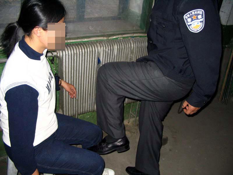 直到早晨八点左右,恶警们陆续来到派出所,恶警李晔东来的比较早,他看到我与被抓的同修,便满嘴脏话,侮辱我。恶警郭强也满口污言秽语,他们两个人用脚猛烈的踢打被铐在暖气管子上的我(演示图2、演示图3),肆无忌惮的狂笑,还大声的诽谤我师父。