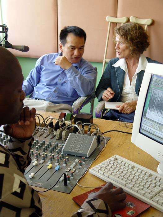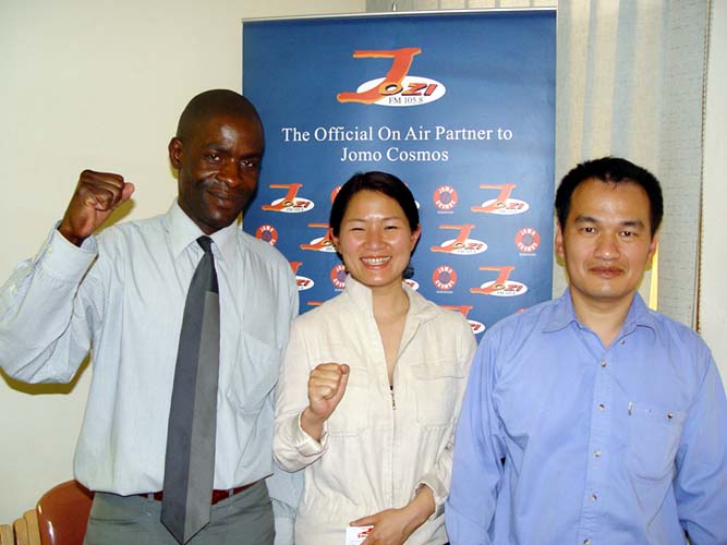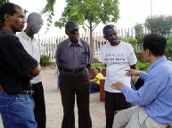 ![]() Jozi广播电台主持人(左一)鼓励梁大卫先生继续炼功,争取早日彻底康复,并尽快把真正凶手绳之以法。 | ![]() 梁大卫接受黑人区最大广播电台采访。 |
