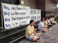 法轮功学员王女士说:江泽民、罗干、刘京和周永康是这场长达五年迫害法轮功的罪魁,截至今天,据不完全统计已有1089名法轮功学员被迫害致死,所以这些邪恶之首必须对中国社会以及国际社会有个正确的交代。我们在中领馆前打开横幅“法办江泽民、法办罗干、法办刘京、法办周永康”也是告诫中领馆的官员,凡是参与迫害法轮功的不法人员,趁早放弃在海外执行江氏集团的“群体灭绝”政策,放弃在海外煽动仇恨等,法轮功学员将应用法律追查江氏集团和追随者。