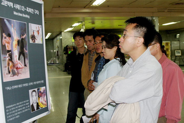 人们观看受真象照片,学员们在讲真象最近,与一般的洪法照片相比,受迫害真象照片更能引起市民的注意。通过站内的大部分市民都在认真的观看了炼功演示之后又领取了资料,有的则倾耳聆听学员们讲真象。江东站虽然往来人流不多,但能在宁静的氛围中观看炼功及照片, 所以这里是个可以深入讲真象的好地方。在这个时间段内路过的行人几乎都能确切的了解真象。
