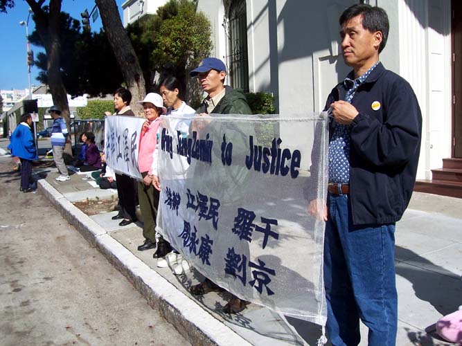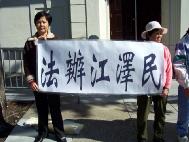 ![]() 法轮功学员要求“法办江泽民” | ![]() 同时要求“法办罗干”、“法办周永康”、“法办刘京” | ![]() 法轮功学员在中领馆请愿 |