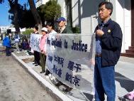 在湾区一家公司做工程师的马先生表示,由于我们不断揭露江集团对法轮功修炼者的迫害,对法轮功的镇压已经是走到穷途末路了,镇压已经维持不下去了。他说,“我今天是来声援法办江、罗、周、刘的诉求,我们必须追究那些迫害法轮功学员的凶手的个人责任。要求法办江罗刘周,正是向还在助纣为虐者传递这样一个讯息,作恶者必须对自己的恶行负责。任何“只是在执行上级任务”的托词,都不能成为他们开脱罪责的借口。”