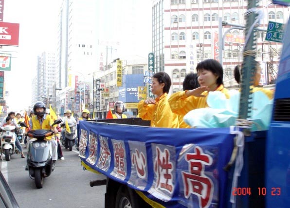 一辆箱型车身以鲜明字样,说明法轮功已洪传世界六十多国、荣获一千两百多项褒奖,创始人李洪志先生并四度获得诺贝尔和平奖提名。短文简要的介绍了法轮功要求修炼者提高道德水准,祛病健身功效卓著,已使全球一亿多人身心健康,在台湾也受到政府高层与社会各界的高度肯定。许多民众都明白了法轮大法是正法,对社会人群有百利而无一害。