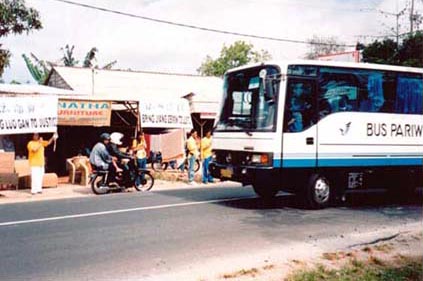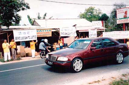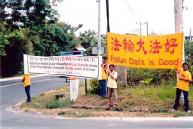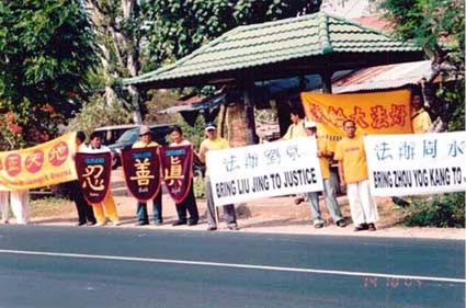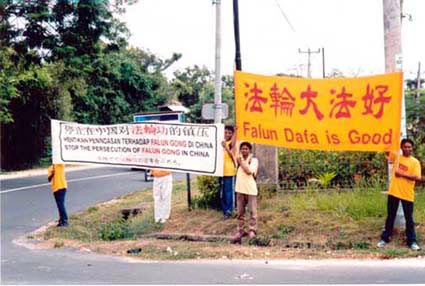 【明慧网2004年10月26日】2004年10月15日星期五,印尼中部时间9点整,大约离旅游胜地神鹰宫300米远处,有数十名法轮功学员在路边排列得整整齐齐等候由官方和企业家组成的中国代表团的到来。学员们手持写着欢迎到印度尼西亚来、法办江泽民、法办罗干、法办刘京、法办周永康、停止在中国对法轮功的镇压、法轮大法好、修炼法轮大法净化身心、法轮大法正人心、真善忍等横幅。