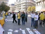 整个一下午,大家共发出去了大量法轮功简介并征集了很多声援法轮功的签名。一张张江氏集团残忍的酷刑折磨法轮功学员的照片打动了很多过往的行人,一位母亲很动情的给她的两个孩子讲解着反酷刑展的照片,很多人当即就签了名支持法轮功学员反迫害。很多的行人都留下来和学员们做长谈,有的想进一步了解法轮功,还有的对法国总统访华时没有提出法轮功问题而向学员们表示歉意。
