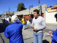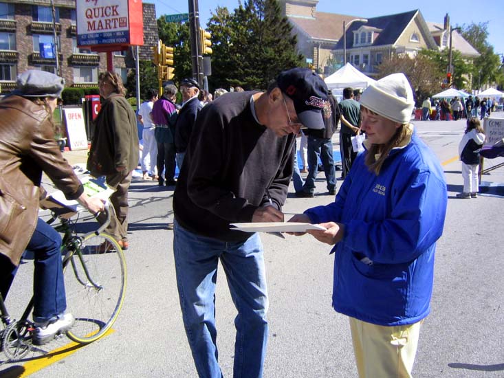 一位派发传单的法轮功学员说,有几次,当疾驰赶路的人在经过他身旁时,都不自觉的停下来,接过传单。