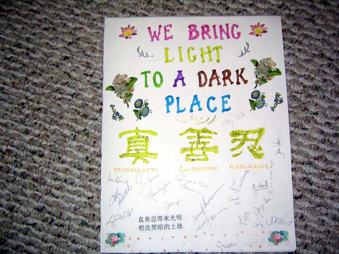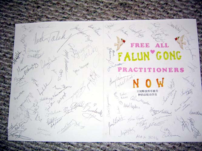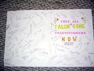 ![]() 寄往中国劳教所的明信卡 | ![]() 许多人在要求释放学员的卡上签名 | ![]() 法轮功学员的展位 |