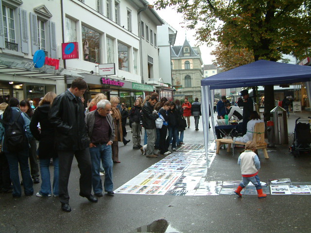 去年,法轮功学员曾到巴登洪法,一位学员用中文为人们写“世界需要真善忍”、“生命需要真善忍”和“真善忍”等条幅。今年又见法轮功来到巴登,就有人走到摊位前问,写中文条幅的那位先生来了吗?当得知写条幅的学员没来时,他说我要中文写的“真善忍”。学员找到一个写有“真善忍”的书签给了他,他也很高兴。这时一位女青年高兴的说,我已经有了“世界需要真善忍”的条幅,并已挂到了墙上,是去年一位炼法轮功的先生为我写的。她还向这位青年解释什么是真善忍!这位青年连连点头说,真善忍真好!