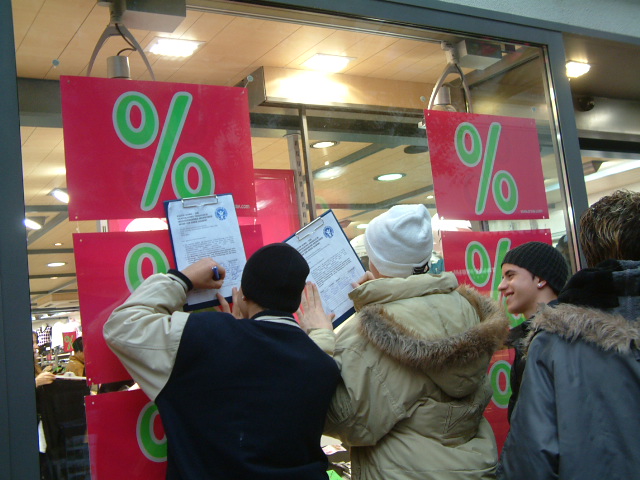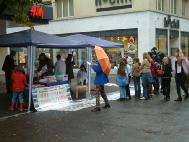 川流不息的人群涌向法轮功学员的展地,观看真人模拟的酷刑和图片展。当一些先来的青年人看到自己的同学也走过来时,主动的将他们知道的真象转告其伙伴,这群青年人立刻签名支持法轮功,并表示他们一定把自己知道的真象告诉他们的亲朋好友。