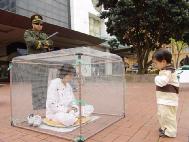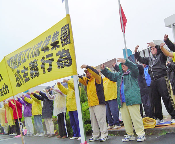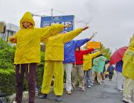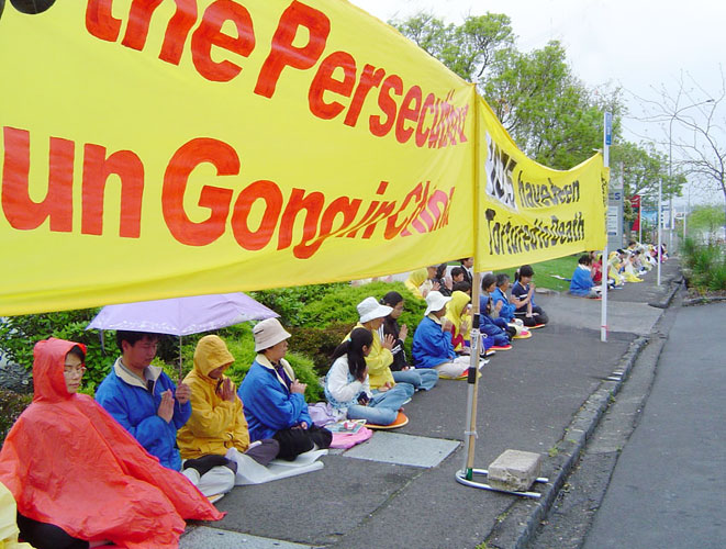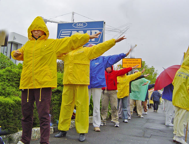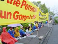 23日清晨,沉云蔽日,然而再大的阴雨也挡不住法轮功学员们在中国使馆前的炼功请愿活动。
