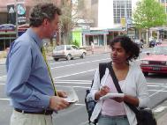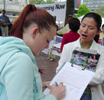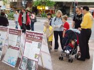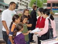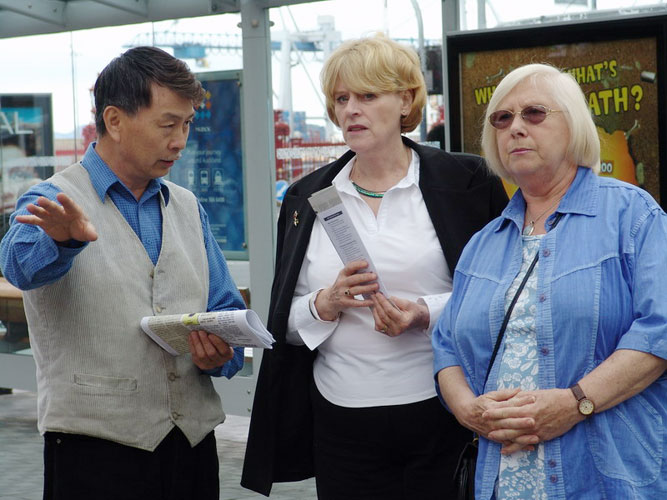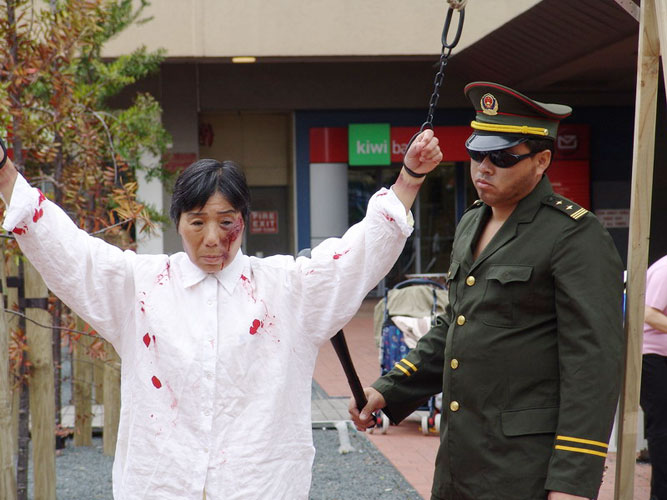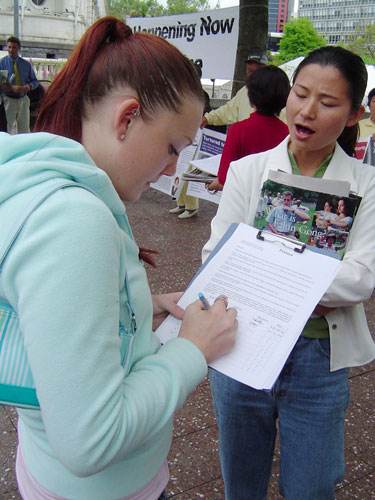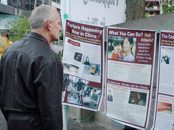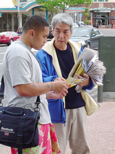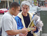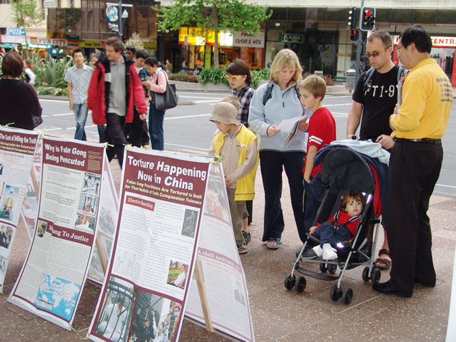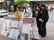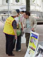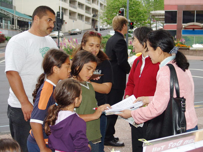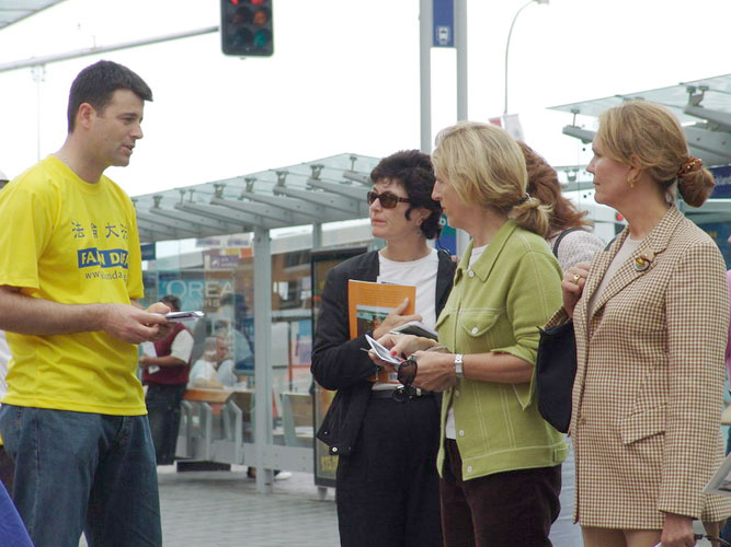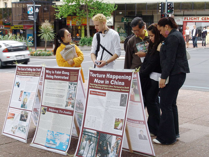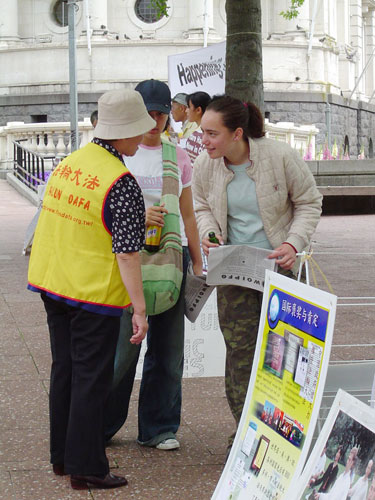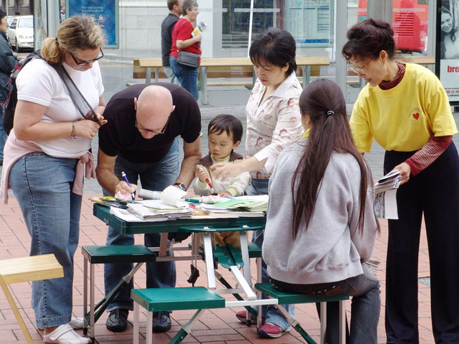 一个以图文、真人模拟的展示法轮功学员在中国受迫害的展览出现在奥克兰街头,学员们向参与会议的律师们及市民发资料、征集签名、展示功法、讲真象,引起不少律师的关注并引来了很多过路人停留观看、了解真象。有的当地人马上要求学习五套功法,询问炼功地点。还有个在大学里学习传媒的学生,详细了解了法轮功后,主动要写报道给报社,并决定用法轮功的故事作为她今年的毕业论文题材。