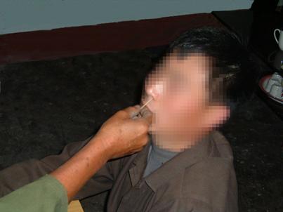 ![]() 2000年4月24日于河镇陈永华等恶人,用茶碗底部将大头针往大法弟子指甲缝里砸。 | ![]() 2000年4月24日于河镇陈永华等恶人,用大头针刺大法弟子的鼻孔。 |