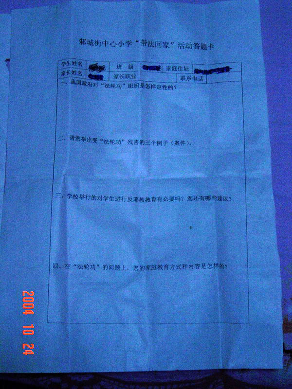 新洲区委610办公室还指使各学校毒害学生,搞各种迫害法轮功的活动,如邾城街中心小学搞的《邾城街中心小学“带法回家”活动答题卡》,阳逻中心小学搞的《阳逻街中心小学反X教宣传活动资料》,学校还利用班会、专刊、作文等形式诱骗学生说法轮大法的坏话,甚至还要逼迫家长签名参加对法轮大法的犯罪。