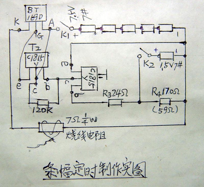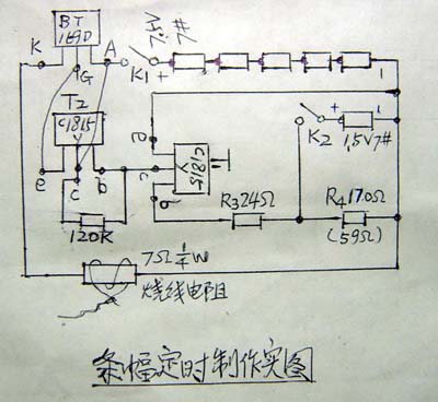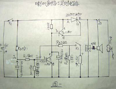 3. 电路工作原理:合上开关K2接通延时电路(7号1.5V电池开始放电延时约24小时晚上挂前再合K1),待电压降值T1三极管b极0.52V时管慢速关闭,T2管导通触发可控硅喇叭响。(也可把T1管换高速开关管2SC4452——4455都行,略贵)