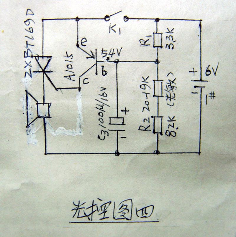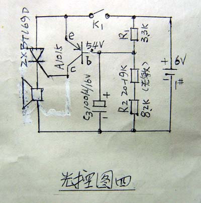 3. 例:设定喇叭早上六点响,设计启动电路阻值是19K光敏电阻把光敏电阻用纸包多层(增大阻值降灵敏度,图一光敏电阻已包A4纸5层6点响,有型号气温差异)均匀对正早上6点时的天光(晴天)用万用表快测量阻值达19K左右,阻值随天亮光强在变。安在电路上再微调R1或R2即响(或模拟电路)。管T1标的是启动电压,测表内阻分流测完再细调响为准时,或监测可控硅K漏电流慢启动从0——0.7约十分钟左右。光敏电阻安在喇叭的明亮处感光定时,晚上挂时再合上开关K1(光敏0.5至1元)
