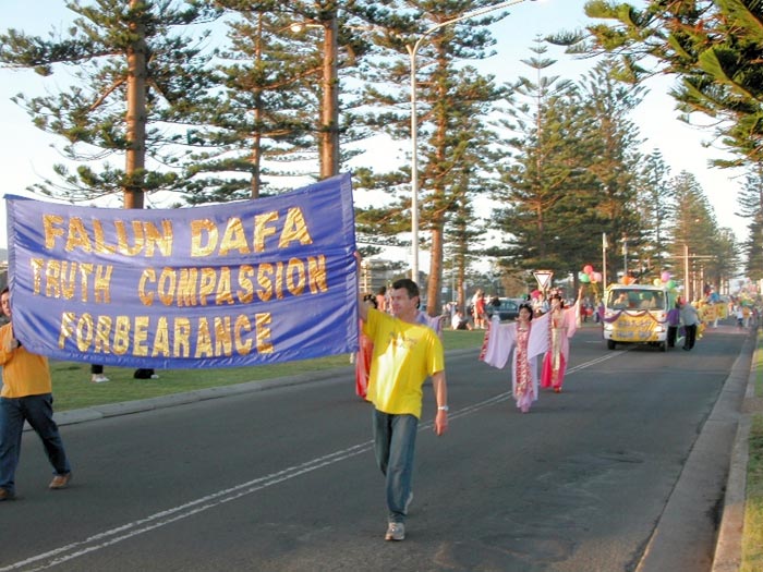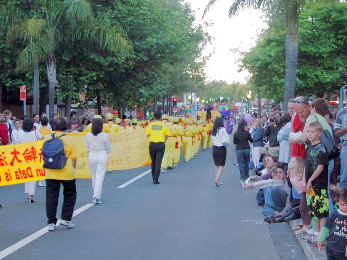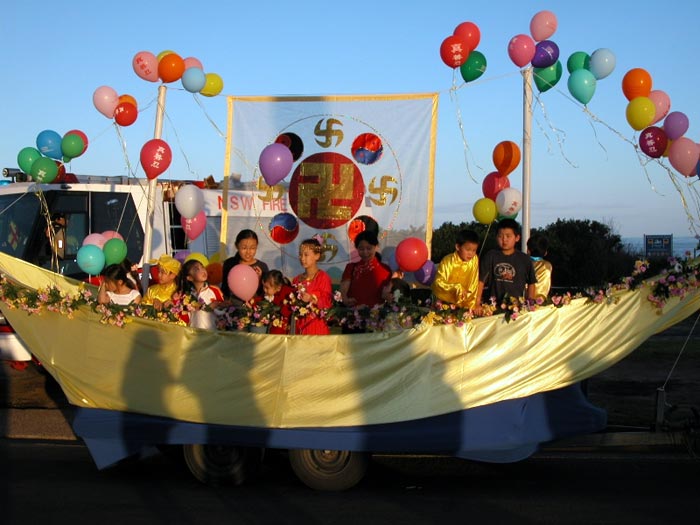 法轮功学员队伍的最前面,为英文横幅,上写“Falun Dafa”;下写“Truthfulness Compassion Forbearance”。接着是4位身着唐装的女学员,一辆色彩鲜明,点装亮丽的花车,上有4位学员展示法轮大法5套功法。腰鼓队之后跟着的,是学员们称之为“法船”的船,船上高悬着一布制的彩光夺目的大法轮图形,船上有20多个小弟子兴高采烈的向观众打招呼。之后,有众多学员手持世界各种语言的“法轮大法”、“真善忍”的旗子,再后便是身着丽装的“仙女”,最后是法轮大法遍传60多个国家的英文横幅。