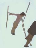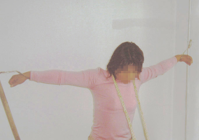 把法轮功学员用手铐铐在墙上的铁环上,两臂拉直,整个人呈“十”字形。恶警还形容说象耶稣一样。然后用一根绳子一端套在法轮功学员的脖子上,另一端固定在2米多远的地方,再由恶警踩绳子。那滋味就象“五马分尸”一样。两手腕被手铐铐到肉里,鲜血从腕部往下淌,不仅如此,两个女警察还用毛毛草划法轮功学员的耳部、面部,奇痛、奇痒,惨无人道。