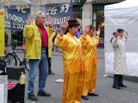 在学员们炼功时,不知何时又出现了当地一家主要媒体的记者,扛着摄像机正巧从这里经过,被学员们的炼功场面所吸引,于是,走近我们的信息台,把学员们的炼功及我们的信息展台仔细拍摄了十多分钟,才满意离去。