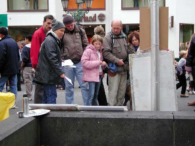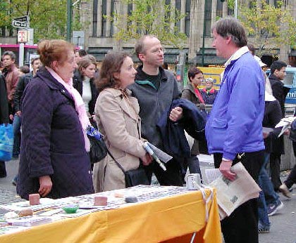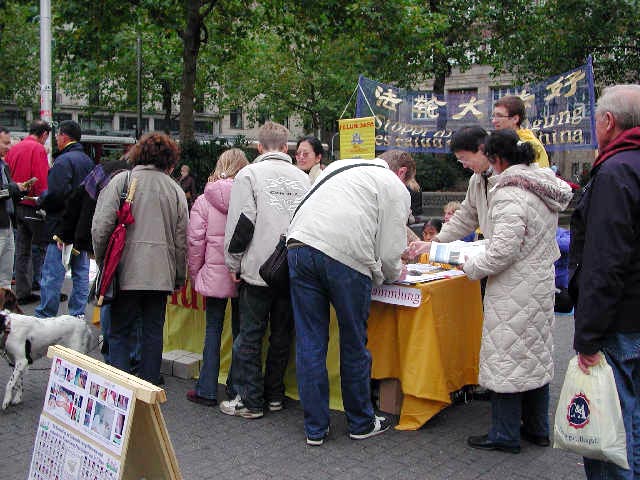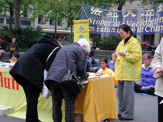 20多名学员自发而来,有序的配合着,使这次信息日的各项活动有机而又顺利的进行着。在这个国际性的城市里,来来往往的人流人种不同,操持的语言不同,学员们也随机应变,操着德语、汉语、英语、日语、俄罗斯语等讲着真象,同时把不同语种的真象材料源源不断的发到人们手中,以大法赋予的智慧和救度众生的慈悲,从容自如的讲清真象,用大法弟子的正念正行,揭露着迫害,反对着迫害,救度着众生。