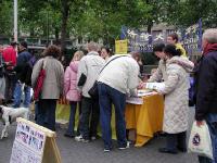 众多的过往游人开始光顾我们的信息展台,观看学员炼功的,仔细阅读真象展板的,听闻学员讲真象的,签名反对迫害的人,象潮水更替似的,一会儿涌上一拨人,一会儿又涌上一拨人。