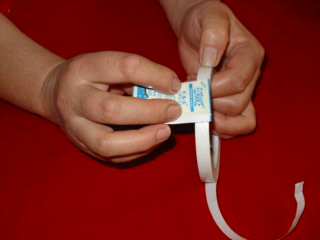 图三:把一卷双面胶带,撕下白纸条,露出粘的一面,再把花安适洁护液粘到双面胶带上,然后撕下来,花安适背面就粘上双面胶了。