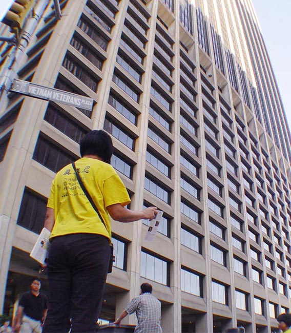 ![]() 来自芝加哥的Susan 在著名的水街55号和“越战退伍军人广场”前分发传单 | ![]() 宾州的Lynn在向一名过路者介绍法轮功 | ![]() 一名西方法轮功学员在水街55号前分发法轮功真象报纸 |