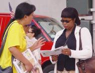 ![]() 法轮功学员在“越战退伍军人广场”前办酷刑展。 | ![]() 一位妇女向肯塔基州的王先生询问法轮功的问题。 |