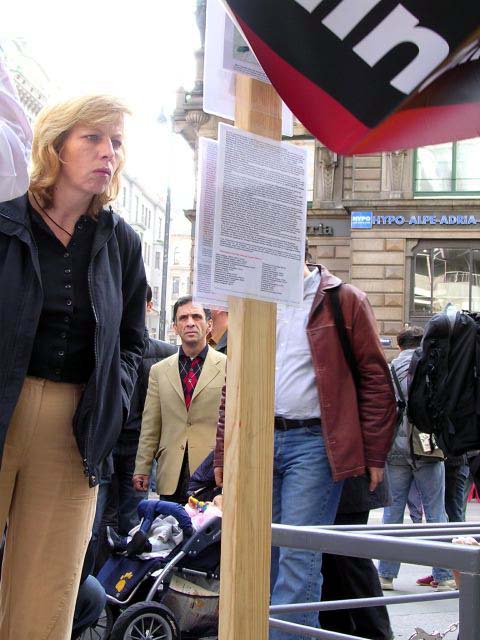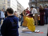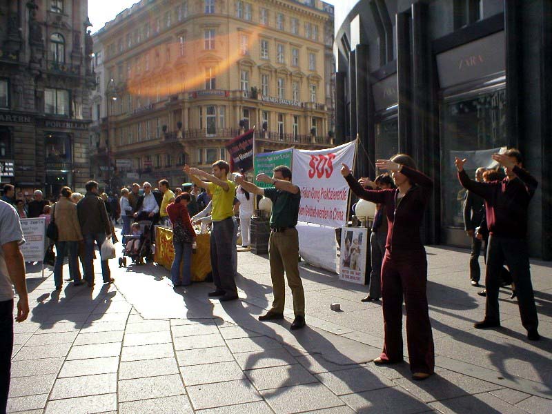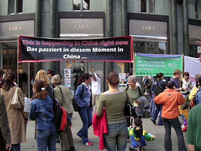一位奥地利的老夫人告诉学员她在半年前就从学员们那里得到了关于在中国发生的迫害的报纸,她不但自己认真读了,还给她的朋友看;她说世界上有很多不好的事情发生,而法轮功学员们仅仅因为修炼与信仰而被如此残酷的迫害,这实在太邪恶了。还有几位过路的西人居然会说中文,他们用中文与学员探讨了在中国发生的事情。有的中国人向学员主动索取真象材料,他们很惊讶在中国会发生这样的事情,纷纷表示要好好了解了解情况。