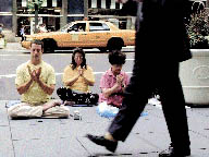 犹太人周报(Jewish Week)10月1日报道,在最近的一个星期一下午,纽约42街和第三大道的街角如同往常一样,充斥着各种出租车、轿车、卡车、行人、小商贩和警察的喧嚣嘈杂声。然而,在这嘈杂中,40岁的劳瑞-哈埃尔(Lori Har-El)坐在人行道旁静静的沉思。她正在打坐,赤着脚,微闭着双眼,面容祥和平静。她出生在以色列,生活在以色列的一家集体农场,但是现在,她在纽约是一名积极的法轮功学员。法轮功是一项中国的打坐功法。